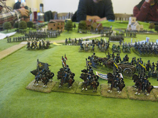 The Prussian artillery of the central ridge ineffectively open fire and roll a double 1 thus discovering they've misplaced the ammo wagon. Drat! |